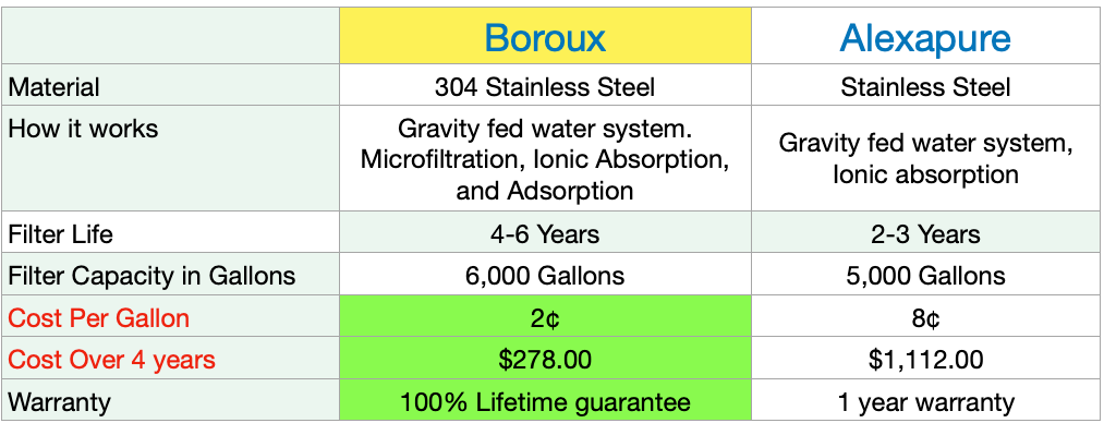 The Boroux was so much cheaper to operate than the Alexapure. With the Boroux, it only costed you 2 cents to produce a gallon of pure clean water. The Alexapure was 4 times as expensive at 8 cents a gallon. In fact, if you wanted to compare the cost of all 18 competitors and buy just on the basis of cost, you would still end up with the Boroux as the king, at only 2 cents per gallon, while the entire competition ranges between 8 cents to 45 cents per gallon. And the outperformance of Boroux did not just stop there. The Boroux had a 100% Lifetime guarantee on the filters while the Alexapure had only a 1 year warranty. It is our impression that the Boroux is the very best water purifier on the market today. As a bonus for our clients, use our discount code - CROW.