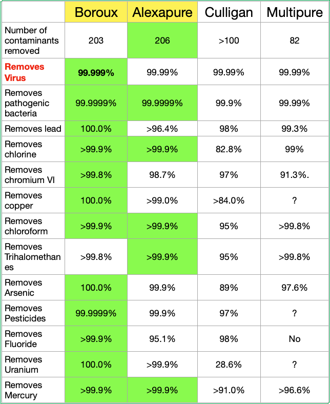 Now it is a contest between the water purifiers who are still standing and they are in the below chart. We found that Boroux (the original supplier for Berkey) and Alexapure far outperformed the other 2 in every department listed below. Alexapure topped some categories while the Boroux topped some others including virus. The highlighted green shows the best numbers in each category.